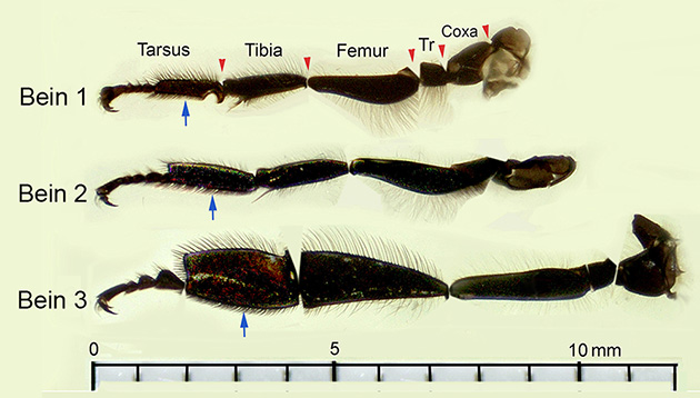 Vergleich der drei Beinpaare (1, 2, 3) und deren Gliederung in verschiedene Segmente. Tr = Trochanter. Beachte das 1. Tarsalglied (blaue Pfeile), das bei Bein 1 eine Putzrinne f?r die Antenne tr?gt und bei Bein 3 starkverbreitert ist und als Pollensammelapparat dient.