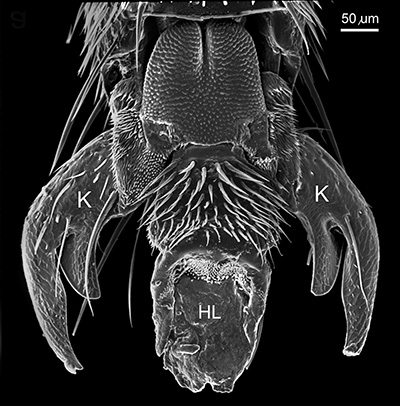 Tarsalklaue, Ventralansicht: Jede Klaue (K) ist zweigeteilt und tr?gt mehrere kurze und lange Sinneshaare. In der Mitte liegt ein ausklappbarer Haftlappen (HL), der ein Laufen auf glatten Fl?chen (z. B. Glas) erm?glicht.