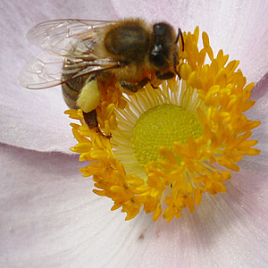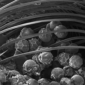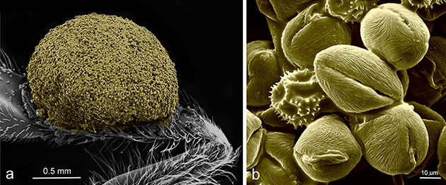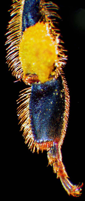 Das 3. Beinpaar der Honigbiene besitzt einen speziellen Sammelapparat f?r Bl?tenstaub (Pollen). Die am haarigen K?rper h?ngen gebliebenen Pollenk?rner werden mit den Pollenb?rsten auf dem 1. Fussglied abgeb?rstet und auf die Aussenseite des Unterschenkels (Tibia) geschoben. Dort h?ufen sie sich im sog. Pollenk?rbchen an, so dass die Biene an den Hinterbeinen regelrechte "H?schen" aufweist (rechts oben). Die einzelnen Pollenk?rner