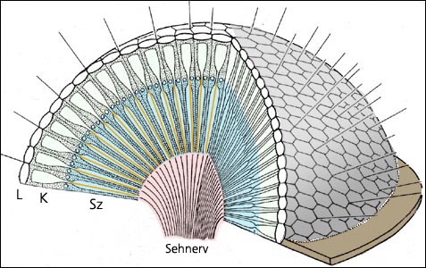 Jedes Einzelauge besteht aus durchsichtiger Linse (L) und Kristallkegel